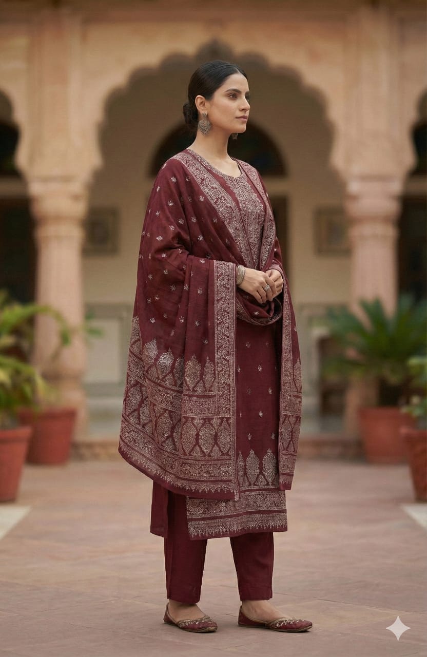 Women’s Mustard Pure Silk Suit Set with Embroidered Neck & Banarasi Dupatta