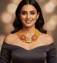 A stunning antique gold metal choker featuring intricate handcrafted detailing, ruby-toned stone accents, and a cascading fringe of miniature gold beads. Regal and timeless, this statement piece adds luxurious charm to weddings, festive looks, and grand celebrations.