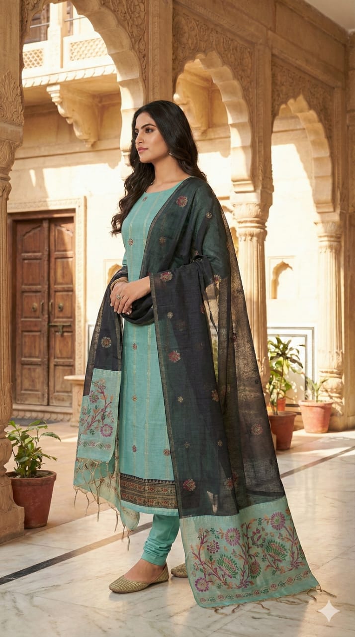Bring effortless elegance to your ethnic wardrobe with this women’s aqua cotton linen suit set featuring a contrast woven dupatta. Designed for comfort and refined style, this suit set is perfect for everyday ethnic and festive wear.