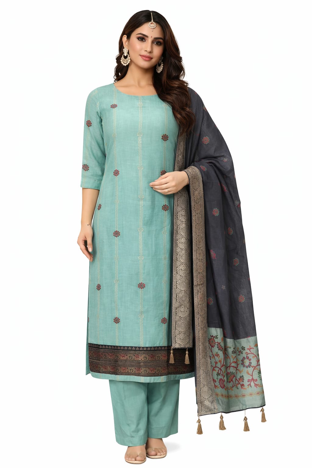 Women’s Aqua Cotton Linen Suit Set with Woven Dupatta – Ethnic Wear