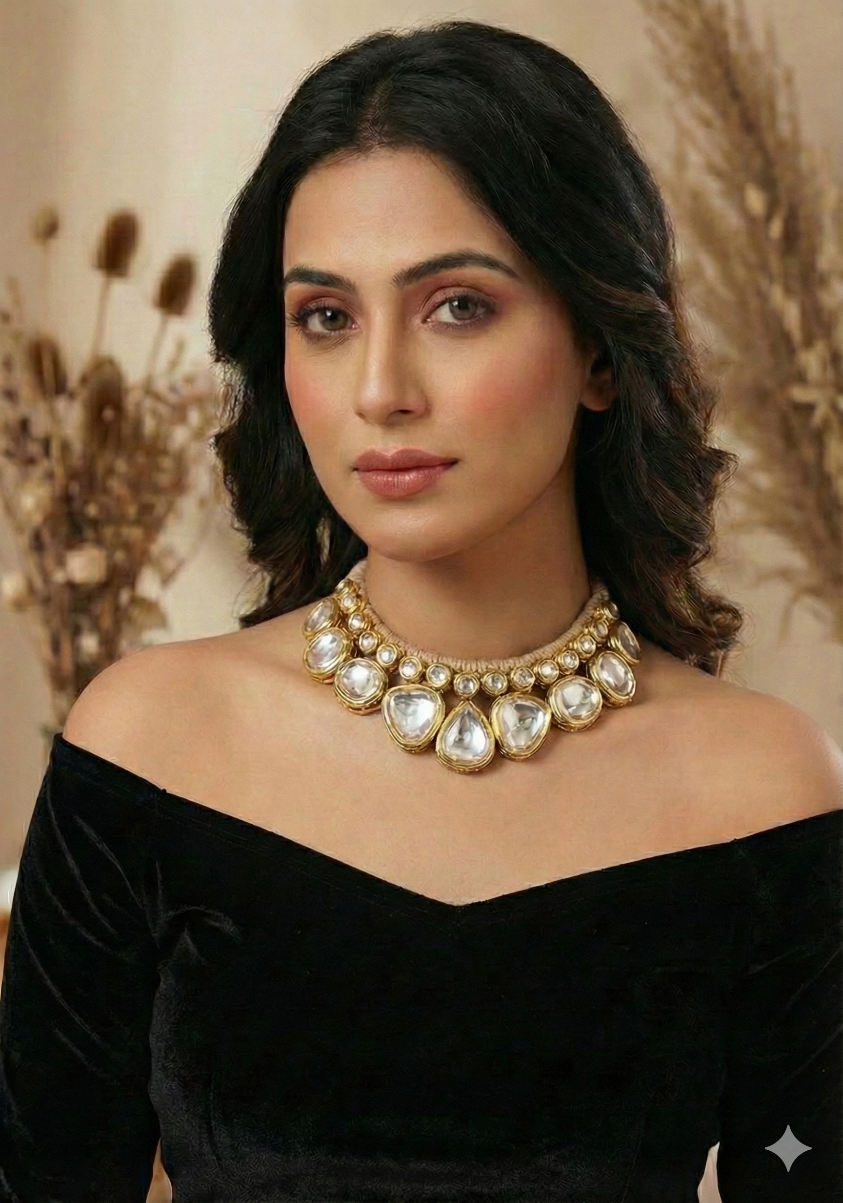 A stunning fusion of tradition and craftsmanship, this handcrafted jute choker features double-layered Kundan stones set in rich golden frames. The earthy jute base beautifully balances the regal shine, making it perfect for weddings, festive wear, and elegant ethnic styling.
