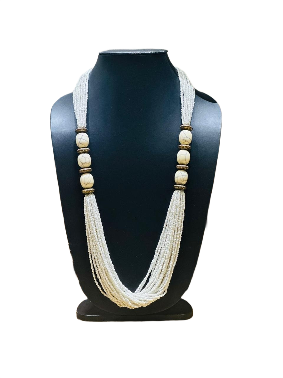 Stylish long white beaded necklace with multi-layer design and stone accents. Perfect for casual, ethnic, and party wear.