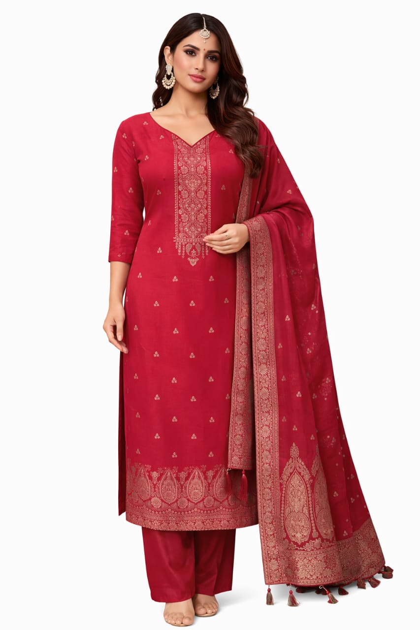 Crafted from premium woollen fabric, this women’s suit set is designed to provide warmth without compromising on traditional elegance. The straight-cut kurta features delicate embroidery on the neckline, complemented by subtle woven motifs across the fabric. Paired with matching woollen bottoms and a coordinated dupatta with traditional borders, this suit set offers a refined ethnic look for colder seasons. maroon woollen suit.