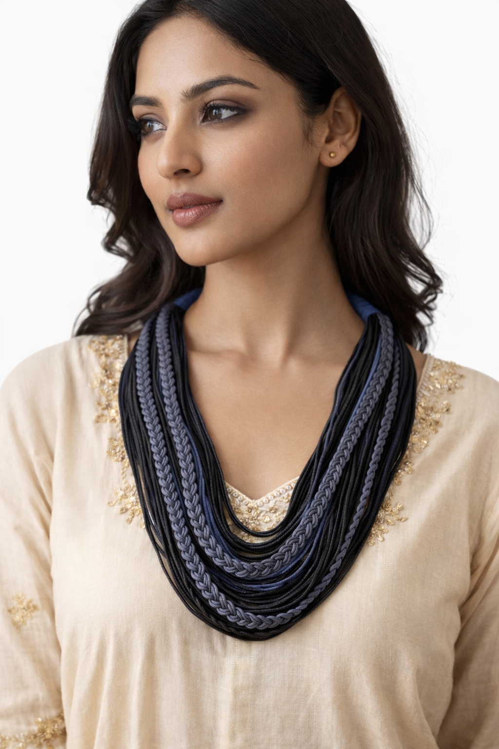 Each strand is layered carefully to create a cascading collar effect. The braided cords provide contrast against the smoother strands, giving the necklace a sculpted appearance.