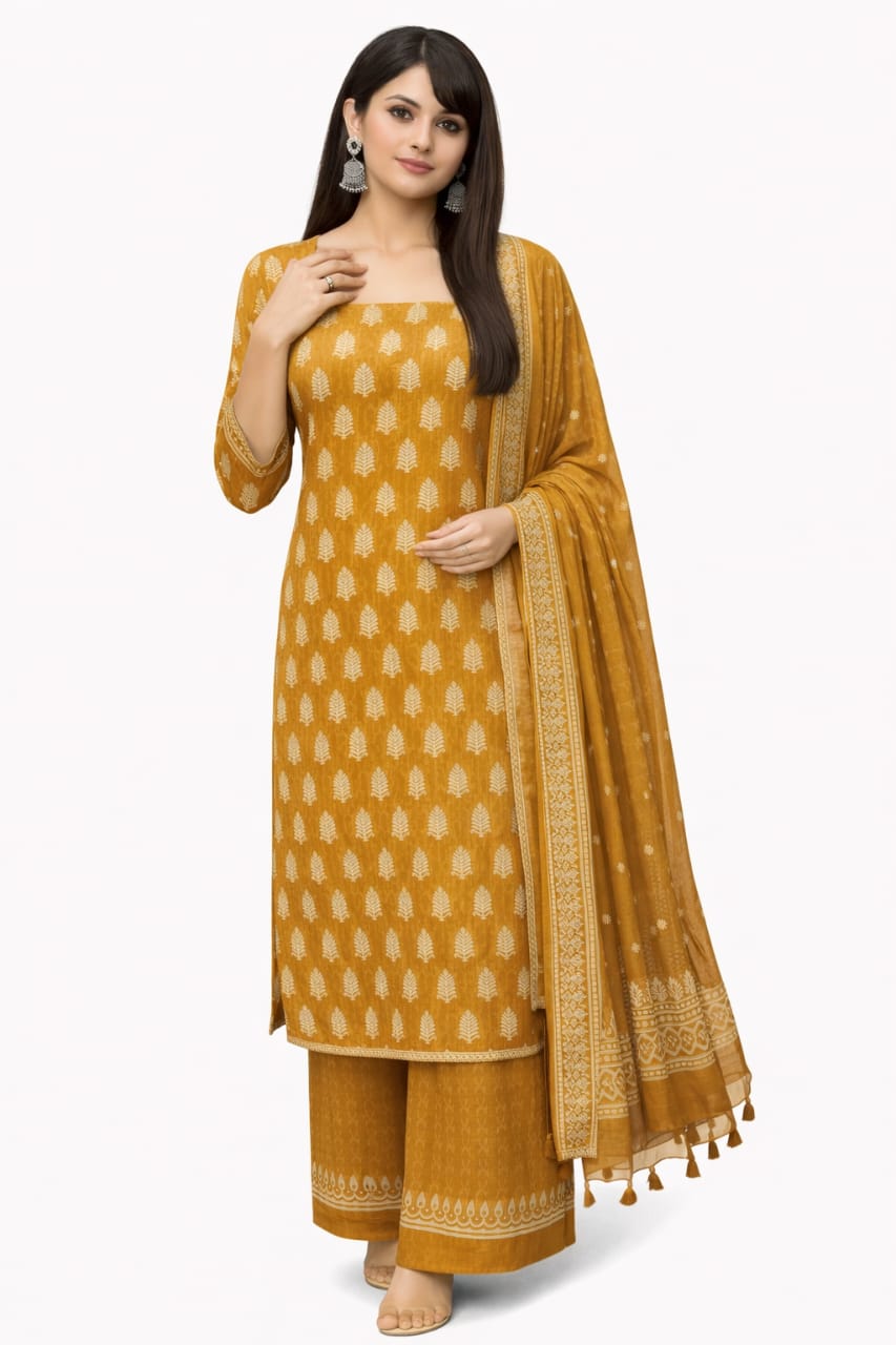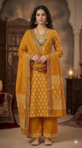 Add timeless ethnic charm to your wardrobe with this women’s mustard cotton Bagru print suit set with dupatta. Crafted using traditional hand block printing techniques, this suit set blends comfort with authentic Indian craftsmanship.