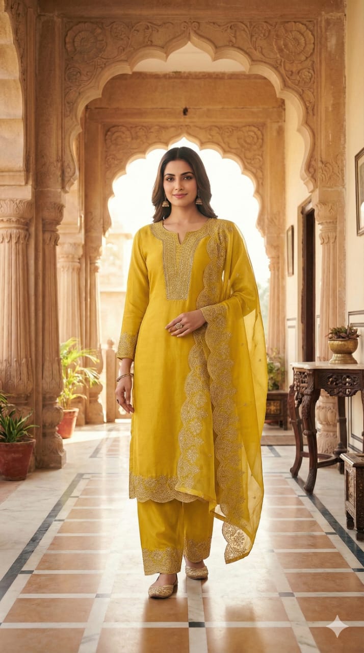 Make a statement at festive and traditional occasions with this women’s mustard pure silk suit set featuring a beautifully embroidered neckline and an elegant Banarasi dupatta. Designed to reflect timeless ethnic elegance, this suit set is ideal for special celebrations.