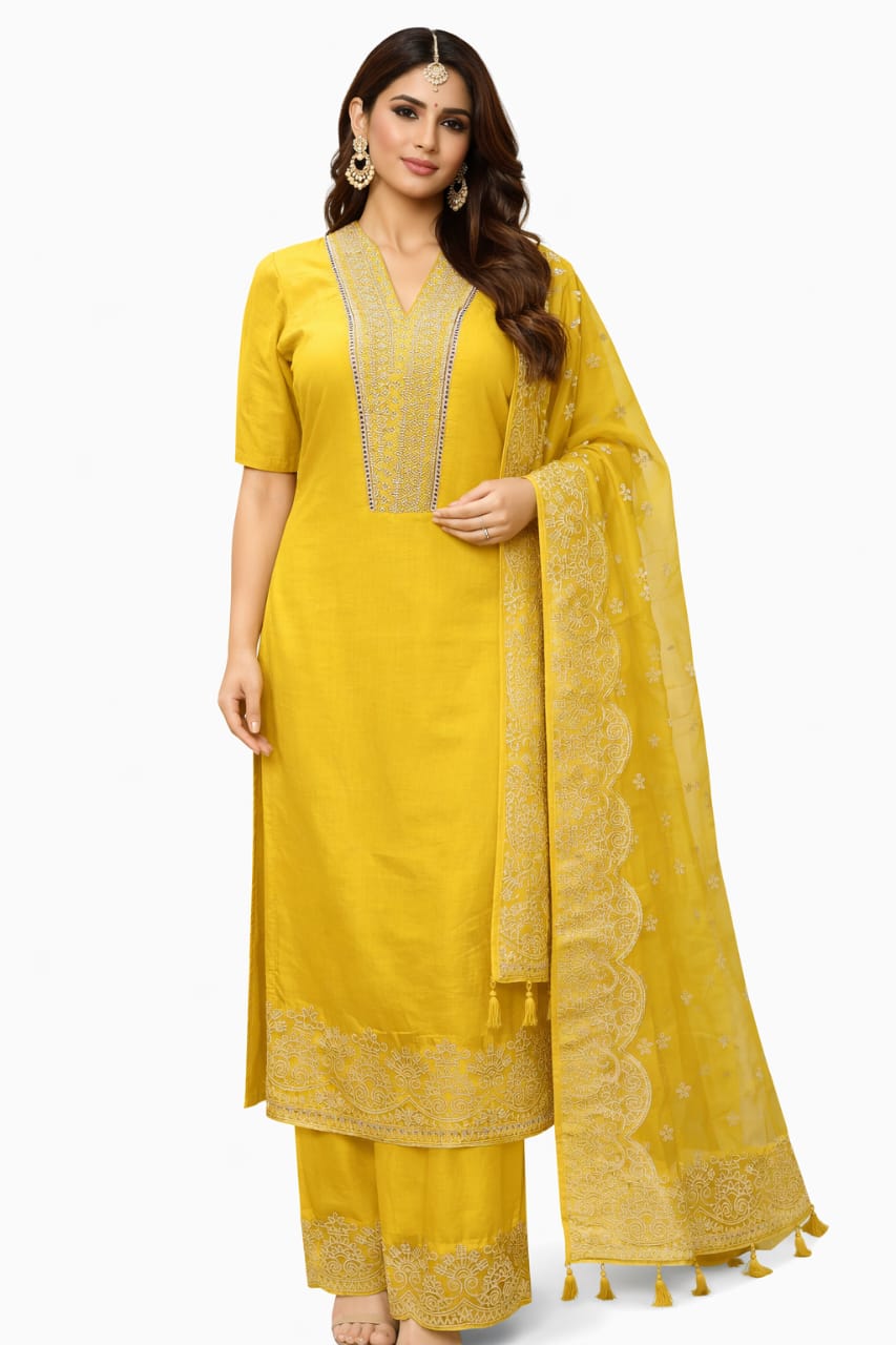 Women’s Mustard Pure Silk Suit Set with Embroidered Neck & Banarasi Dupatta